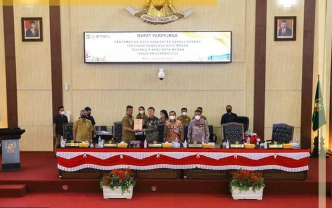 Rapat yang berlangsung di Ruang Rapat Paripurna DPRD Kota Medan, Jalan Kapten Maulana Lubis Nomor 1 Medan ini ditutup dengan penyerahan Nota Pengantar Kepala Daerah terhadap Ranperda Kota Medan tentang P-APBD Kota Medan Tahun Anggaran 2022 oleh Wali Kota Medan kepada Ketua DPRD Kota Medan. (POL/isvan)