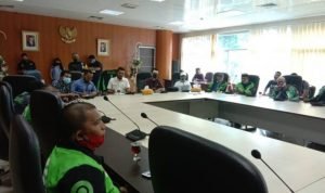 Medan, POL | Ratusan driver ojol yang menggelar aksi unjukrasa ke kantor DPRD Medan diterima sejumlah anggota DPRD Medan di ruang Banmus, Selasa (4/8/2020). Driver ojol menuntut Pemerintah Kota (Pemko) Medan agar dapat mengatur aplikator yang telah semena-mena terhadap para driver ojol.