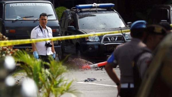 Sebagaimana diketaui 13 November 2019 pukul 08.45 wib terjadi bom bunu diri di Polrestabes Medan Jl HM Said Medan. Diperoleh informasi bom bunuh diri yang dilakukan diduga dua orang mengunakan atribut ojek online dan meledak disekitar kantin Polrestabes Medan. (POL/lin)