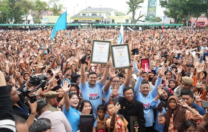 Piagam penghargaan rekor MURI Dunia tersebut diserahkan langsung oleh Direktur Operasional Museum Rekor Indonesia (MURI) Yusuf Ngadri kepada Wali Kota Medan, Bobby Nasution dalam acara puncak Gebyar Pendidikan Kota Medan 2024 yang diselenggarakan di Lapangan Benteng Medan, Minggu (26/5/2024).