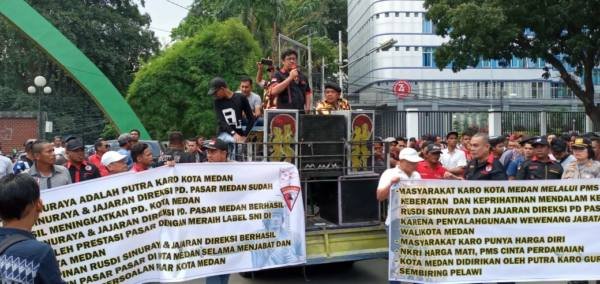 Aksi demo damai ini mereka lakukan dengan membentangkan spanduk besar serta melakukan orasi yang pada intinya mengecam pemecatan Rusdi Sinuraya sebagai Dirut PD Pasar Medan.