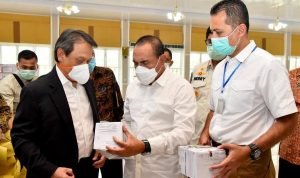 Medan, POL | Gubernur Sumatera Utara (Sumut) Edy Rahmayadi menerima bantuan Alat Pelindung Diri (APD) dari Pemerintah Singapura melalui konsulat jenderal di Medan. Bantuan tersebut diberikan langsung oleh Konsul Jenderal Singapura Richard Grosse kepada Edy Rahmayadi di Rumah Dinas Gubernur Sumut, Jalan Sudirman Nomor 41 Medan, Kamis (9/4/2020).