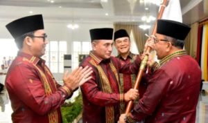 Medan, POL | Tabuhan gordang sambilan terdengar di seluruh Pendopo Rumah Dinas Gubernur Sumatera Utara (Sumut), Jalan Sudirman Nomor 41 Medan, Jumat (30/8/2019) siang. Gendang ditabuh mengiringi sekelompok pria pengurus Himpunan marga (Hima) Lubis yang sedang menarikan tor-tor penghormatan kepada Gubernur Sumut Edy Rahmayadi.