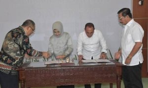 Medan, POL |  Gubernur Sumatera Utara (Gubsu) Edy Rahmayadi bersama Ketua TP PKK Sumut Nawal Edy Rahmayadi menyaksikan penandatanganan kerja sama antara Yayasan Marbisuk dengan Dinas Pendidikan Provinsi Sumut, Sabtu (15/6) di Rumah Dinas Gubernur, Jalan Sudirman Nomor 41 Medan.