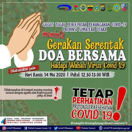 “Kita mengimbau kepada seluruh masyarakat Sumut untuk melaksanakan doa bersama secara serentak pada tanggal 14 Mei 2020, pukul 12.30-13.00 WIB,” ujar Sabrina.