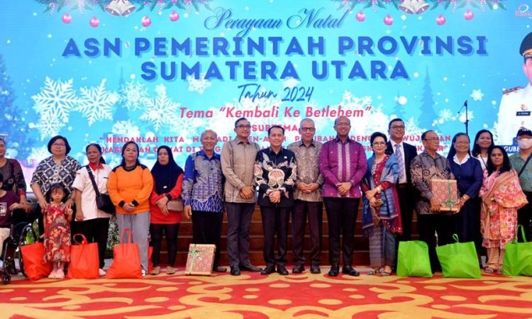 Medan, POL | Penjabat (Pj) Gubernur Sumatera Utara (Sumut) Agus Fatoni mengajak para Aparatur Sipil Negara (ASN) di lingkungan Pemerintah Provinsi (Pemprov) Sumut yang merayakan Natal, untuk terus menggelorakan semangat Natal dengan saling berbagi dan menyebarkan cinta kasih antar-sesama. Hal itu disampaikannya pada perayaan Natal ASN Pemprov Sumut di Aula Raja Inal Siregar, Kantor Gubernur, Medan, Sumatera Utara, Rabu (18/12/2024) malam.