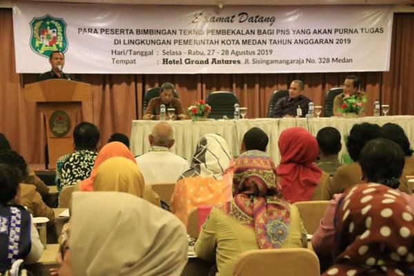 Medan, POL | Sebanyak 150 Apratur Sipil Negara (ASN) di lingkungan Pemko Medan yang akan memasuki masa purna tugas (pensiun) mengikuti Bimbingan Teknis (Bimtek) Pembekalan di Grand Antares Hotel Jalan Sisingamangaraja, Medan, Selasa (27/8). Bimtek ini bertujuan untuk memberikan penjelasan maupun strategi tentang bagaimana caranya menghadapi masa pensiun. Dengan demikian usai menjalani tugas dan pengabdiannya sebagai ASN, mereka siap untuk menjalani masa pensiun tersebut.