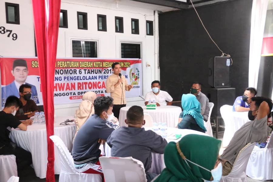 Medan, POL | Anggota DPRD Kota Medan Ihwan Ritonga, SE.MM menampung keluhan Warga Jalan Menteng Raya Kelurahan Pasar Binjai Kecamatan Medan Denai terkait sampah saat menggelar acara Sosialisasi Perda No.6 Tahun 2015 tentang Pengelolaan Persampahan, Minggu (10/4/2021).