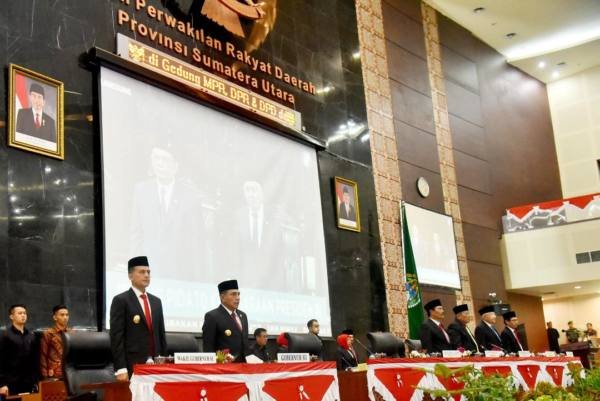 Medan, POL | Gubernur Sumatera Utara (Sumut) Edy Rahmayadi dan Wakil Gubernur (Wagub) Sumut Musa Rajekshah menghadiri Rapat Paripurna Mendengarkan Pidato Kenegaraan Presiden Republik Indonesia (RI), Jumat (16/8/2019) pagi, di Gedung Paripurna DPRD Sumut, Jalan Imam Bonjol Medan.