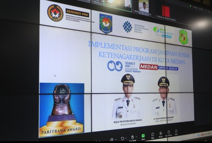 Medan, POL | Wali Kota Medan Rico Tri Putra Bayu Waas mengikuti wawancara nominasi penghargaan Paritrana Award 2025 tingkat Provinsi Sumatera Utara (Sumut). Wawancara tersebut dilaksanakan secara zoom meeting bersama tim penilai dari Dinas Ketenagakerjaan Provinsi Sumut dan BPJS Ketenagakerjaan Sumut melalui Command Center, Kantor Wali Kota, Selasa (16/9/2025).