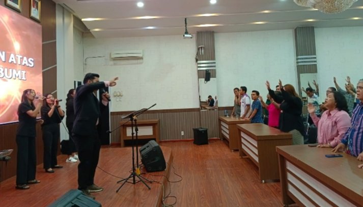 Medan, POL | Jemaat Gereja Elim Kristen Indonesia (GEKI) melaksanakan ibadah di ruangan kantor Wali Kota Medan, Minggu (11/6/2023). Ibadah ini dilakukan oleh Jemaat GEKI setelah Wali Kota Medan Bobby Nasution mempersilahkan mereka untuk beribadah di dalam kantor ,tidak lagi beribadah diluar halaman kantor Wali Kota seperti sebelumnya.