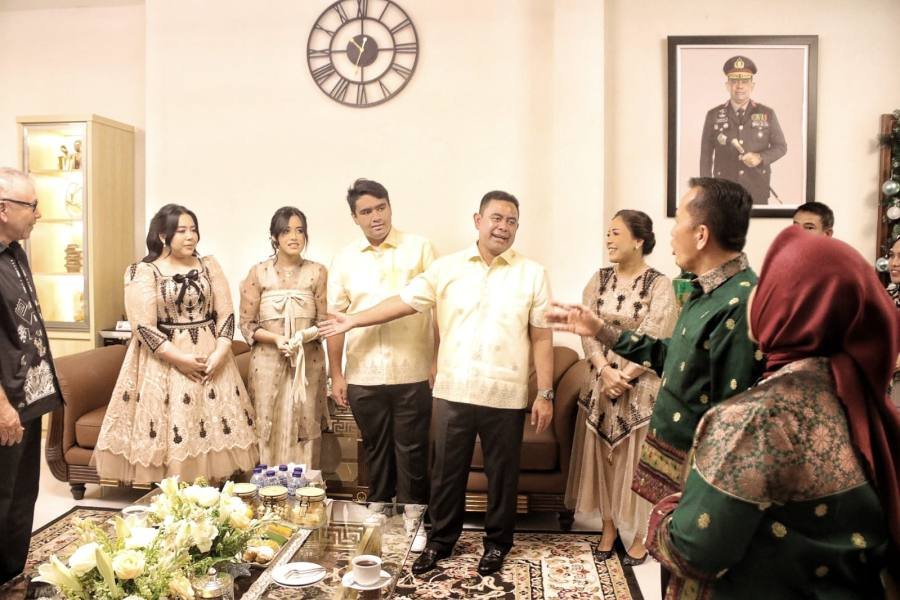 Medan, POL | Penjabat (Pj) Gubernur Sumatera Utara (Sumut) Agus Fatoni dan istri Tyas Fatoni menghadiri open house di Rumah Dinas (Rumdin) Kapolda Sumut Irjen Pol Whisnu Hermawan Februanto, Jalan Walikota Nomor 2 Medan, Rabu (25/12/2024). Acara tersebut dalam rangka perayaan Natal 2024′
