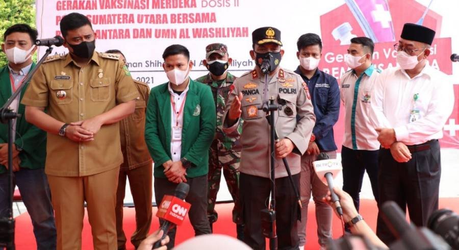 Medan, POL | Kapolda Sumut, Irjen Pol Panca Putra Simanjuntak, meninjau pelaksanaan vaksinasi mahasiswa dosis II dengan tema Sinergitas Mahasiswa dan Polri dalam Penanggulangan Covid-19 bertempat di Universitas Muslim Nusantara (UMN Al-Washliyah), Senin (6/09/2021).