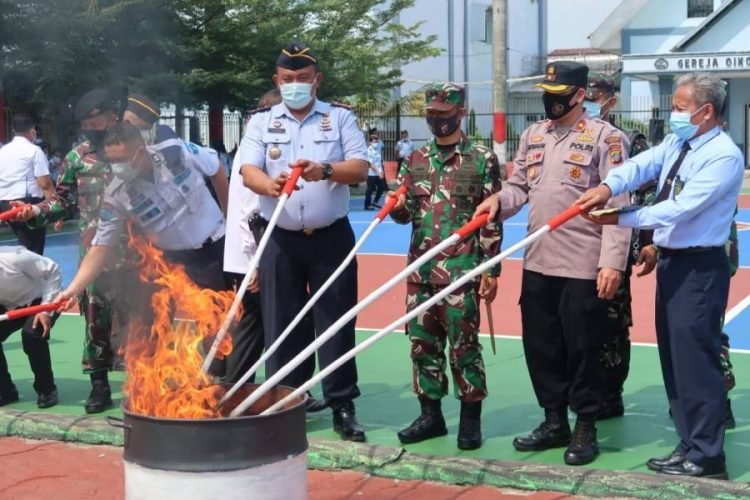 Medan, POL |Kepala Rumah Tahanan (Karutan) 1 Medan dan jajaran bersama Forkopimda Kota Medan lakukan pemusnahan barang bukti hasil Razia selama 6 bulan bertempat di lapangan apel Rutan 1 Medan, Rabu (24/2/2021).
