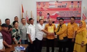 Medan, POL | Rusdi Sinuraya mengembalikan formulir pendaftaran sebagai bakal calon (balon) Wakil Wali Kota Medan Periode 2020-2025 kepada DPC Partai Hanura Medan di sekretariat Jalan Sei Batang Serangan Medan, Sabtu (21/12/2019).