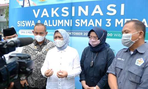 Hal ini diungkapkan Ketua TP-PKK Sumut Nawal Lubis usai mengunjungi kegiatan vaksinasi pelajar di Sekolah Menengah Atas Negeri (SMAN) 3 Kota Medan, Sekolah Luar Biasa (SLB) Karya Murni Jalan HM. Joni dan Panti Asuhan Anugerah Sungai Air Deliserdang, Jumat (1/10/2021). Nawal berharap semakin banyak kegiatan vaksinasi pelajar untuk mempercepat herd immunity.