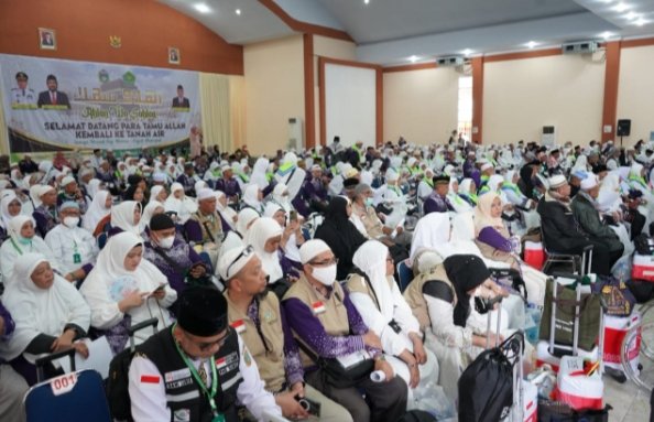 “Saat berangkat ke atanah suci bapak dan ibu masih sebagai calon haji namun saat ini sudah menyandang predikat haji dan hajjah yang mabrur dan mabrurah. Ciri-ciri haji mabrur sudah terlihat saat jemaah haji tiba di tanah air dengan wajah yang penuh dengan kearifan, membawa kesejukan, sabar dan tidak marah-marah,” ungkapnya.