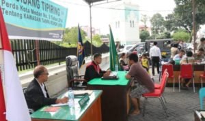 Medan, POL | Sebanyak 18 warga harus menjalani persidangan lapangan karena terbukti melanggar Peraturan Daerah (Perda) No.3/2014 tanggal 30 Januari 2014 tentang Kawasan Tanpa Rokok (KTR) dan Peraturan Wali Kota Medan No.35/2014 tanggal 17 Juli 2014 tentang Petunjuk Teknis Pelaksanaan Peraturan Daerah Kota Medan No.3 /2014 tentang KTR di halaman parkir Masjid Raya Al Mashun, Kamis (28/11). Persidangan lapangan dilakukan karena warga yang umumnya pria itu kedapatan merokok di tujuh lokasi yang telah ditetapkan menjadi KTR.