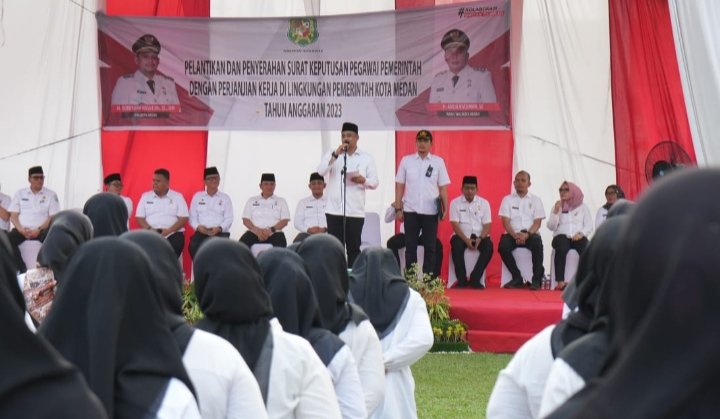 Medan, POL | Wali Kota Medan Bobby Nasution melantik sebanyak 1153 Pegawai Pemerintah Dengan Perjanjian Kerja (PPPK) di lingkungan Pemko Medan tahun 2023 di Stadion Mini USU, Rabu (21/6/2023).
