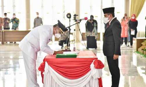 Medan, POL | Gubernur Sumatera Utara (Sumut) Edy Rahmayadi melantik Bupati Mandailing Natal (Madina) M Jakfar Sukhairi Nasution dan Wakil Bupati (Wabup) Mandina Atika Azmi Utammi Nasution, dan Bupati Labuhanbatu Selatan (Labusel) Edimin dan Wabup Labusel Ahmad Padli Tanjung di Aula Tengku Rizal Nurdin, Rumah Dinas Gubernur, Jalan Sudirman Nomor 41, Medan, Kamis (22/7/2021).