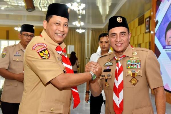 Medan, POL | Ketua Kwartir Nasional (Kwarnas) Gerakan Pramuka Budi Waseso melantik pengurus Majelis Pembimbing Daerah (Mabida) Gerakan Pramuka Sumatera Utara (Sumut) masa bakti 2019-2024, di pendopo Rumah Dinas Gubernur Sumut, Jalan Sudirman, Nomor 41 Medan, Kamis (19/12/2019). Mabida yang dilantik adalah Gubernur Edy Rahmayadi sebagai Ketua, Wakil Gubernur (Wagub) Musa Rajekshah sebagai Ketua Harian dan Sekretaris Daerah (Sekda) R Sabrina sebagai Sekretaris.