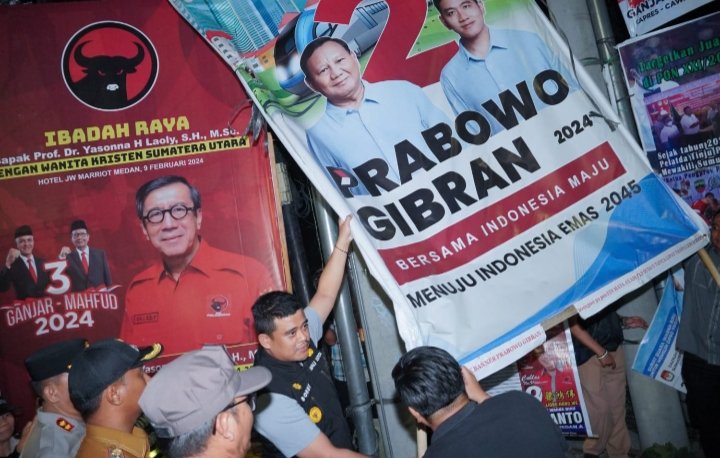 Medan, POL | Memasuki masa tenang Pemilu 2024, Wali Kota Medan Bobby Nasution memimpin penertiban alat peraga kampanye, Minggu (11/2/2024) dini hari. Dengan mengendarai sepeda motor, bersama unsur Forkopimda, Ketua KPU Mutiah Atiqah, Ketua Bawaslu David Reynold, pimpinan perangkat daerah, dan tim gabungan, Bobby Nasution menurunkan baliho maupun spanduk pasangan presiden dan wakil presiden serta calon anggota legislatif di persimpangan Jalan Guru Patimpus dan Bundaran SIB, Jalan Gatot Subroto.