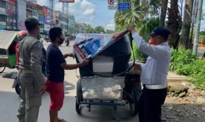 Medan, POL | Memasuki masa tenang menjelang Pemilihan Kepala Daerah (Pilkada) Tahun 2020 pada tanggal 6 hingga 8 Desember, Pemko Medan bekerja sama dengan Badan Pengawas Pemilu (Bawaslu) Kota Medan terus melakukan penertiban terhadap alat peraga kampanye (APK) di Jalan Gatot Subroto tepatnya di depan Plaza Medan Fair, Senin (7/12/2020).
