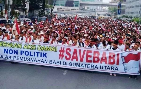 Boasa menegaskan, sejak lahir sampai mati babi jadi budaya di tanah Batak. “Kami makan dari babi. Anak kami kuliah dari babi. Save babi, save babi,” teriak Boasa.