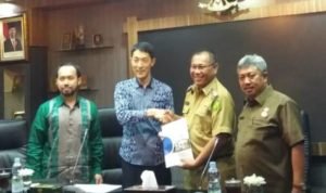 Medan, POL | Wakil Wali Kota Medan Ir H Akhyar Nasution MSi didampingi Kadis Kebersihan dan Pertamanan (DKP) Kota Medan HM Husni menerima Formal Rencana Kerja The Climate and Clean Air Coalition (CCAC) yang diberikan Mr Dr Hiroyuki Kage selaku Direktur Kitakyushu Urban Center Institute For Global Environtmental Strategies (IGES) Jepang di Balai Kota Medan, Selasa (5/3).