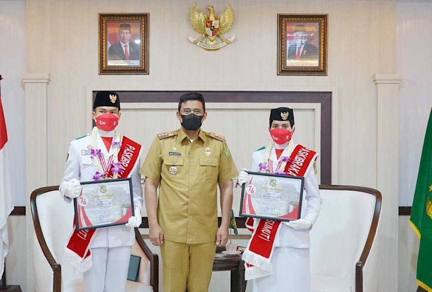 Medan, POL | Wali Kota Medan, Bobby Nasution menyampaikan ucapan terima kasih kepada Ardhelia Muthia Zahwa dan Rifaldy Prayoga atas prestasi yang telah membanggakan Kota Medan dengan menjadi Pasukan Pengibar Bendera Pusaka (Paskibraka) Nasional perwakilan Provinsi Sumatera Utara (Sumut) asal Paskibraka Kota Medan tahun 2021 pada upacara HUT Kemerdekaan RI ke 76 di Istana Negara, Jakarta.