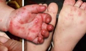 – Setelah sehari dua hari, muncul bintik merah yang melepuh di bagian mulut, telapak tangan, telapak kaki.