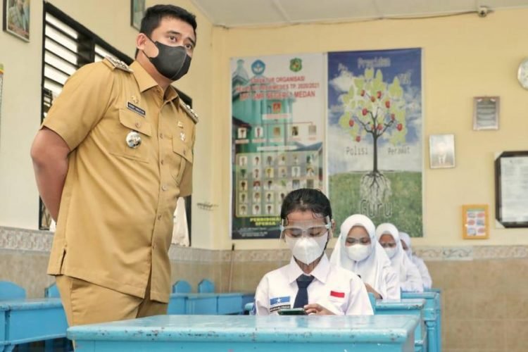 Medan, POL | Simulasi Pembelajaran Tatap Muka (PTM) di sekolah- sekolah Kota Medan telah dilakukan dan ditinjau langsung Wali Kota Medan Bobby Nasution. Selain infrastruktur, sarana dan prasarana untuk penerapan PTM di masa pandemi Covid-19 juga telah disiapkan sekolah – sekolah di Kota Medan, termasuk penyemprotan disinfektan ke ruangan kelas pembelajaran berlangsung.