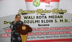 Medan, POL | Sebagai bentuk ungkapan rasa terima kasih atas tugas mulia yang telah dilaksanakan dengan baik dan lancar, saat mengibarkan dan menurunkan Sang Saka Merah Putih dalam upacara peringatan HUT Ke-47 Kemerdekaan RI di Lapangan Benteng Medan, Wali Kota Medan Drs H T Dzulmi Eldin S MSi menggelar jamuan makan malam dengan 43 anggota Paskibraka di Pendopo Rumah Dinas Wali Kota Jalan Sudirman, Medan, Sabtu (17/8/2019).