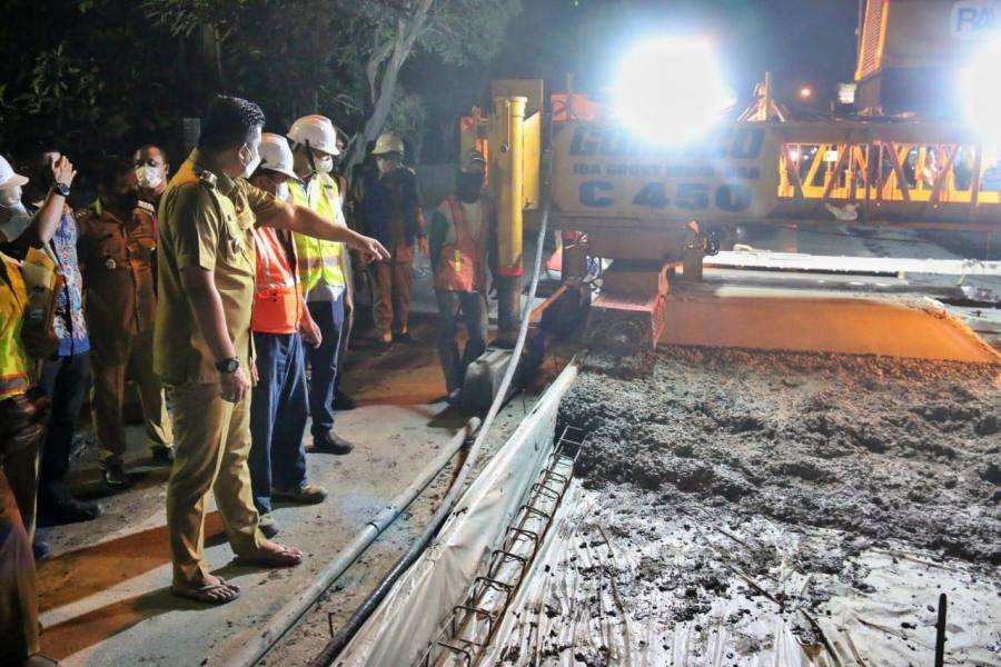 Medan, POL | Wali Kota Medan, Bobby Nasution meninjau proses pembetonan jalan pancing 1 di Kel. Besar, Kec. Medan Labuhan, Selasa (5/10/2021). Peninjauan dilakukan Bobby Nasution mulai dari sore hingga malam hari guna memastikan pembetonan tersebut berjalan dengan baik.