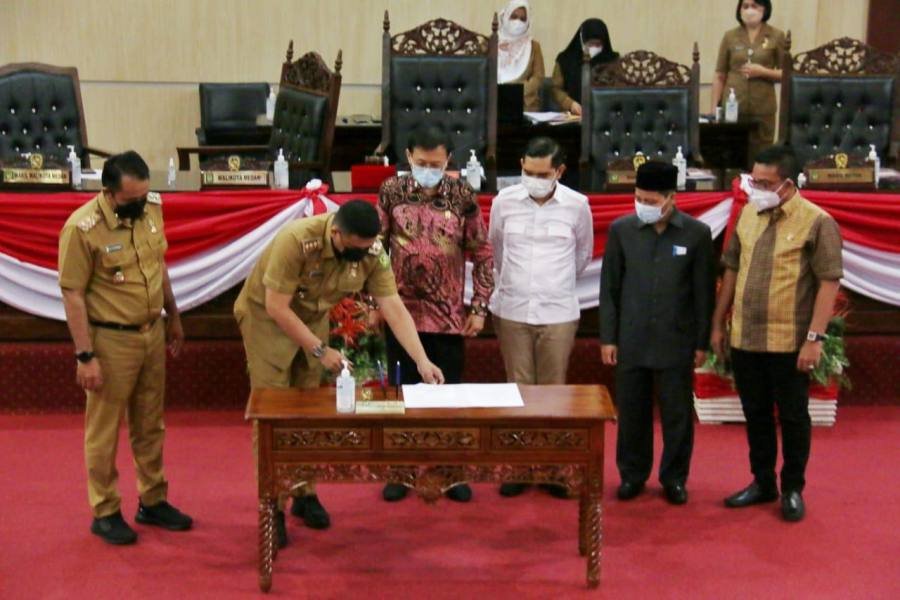 Persetujuan bersama ini ditandai dengan penandatanganan bersama yang dilakukan Wali Kota Medan, Muhammad Bobby Afif Nasution SE MM bersama Ketua DPRD Kota Medan, Hasyim,SE dalam sidang Paripurna DPRD di Gedung DPRD Kota Medan, Senin (26/04/2021).