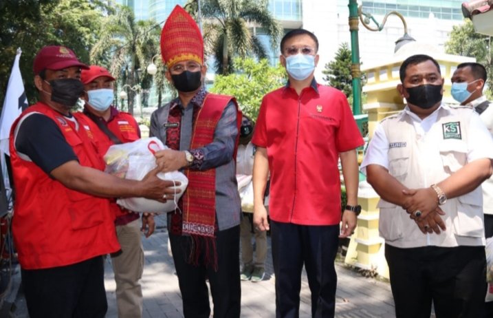 Dengan mengenakan pakaian adat Batak Toba, Sekda Kota Medan dan Ketua DPRD Medan Hasyim SE didampingi Ketua Umum KSJ, Saharudin dan Plt Kasat Pol PP Rakhmat Harahap memberikan secara simbolis 100 paket sembako kepada pengemudi becak bermotor. Adapun paket sembako tersebut berupa beras, minyak makan dan mie instan.