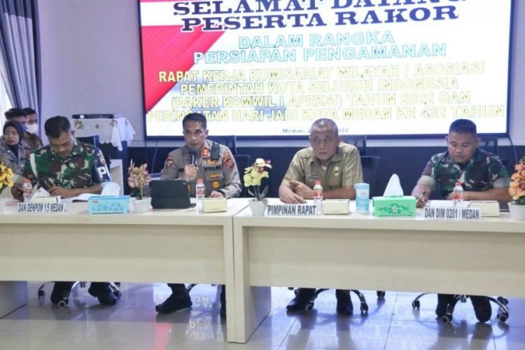 Medan, POL | Jelang berlangsungnya Rapat Kerja Komisariat Wilayah I Asosiasi Pemerintahan Kota Seluruh Indonesia (Raker Komwil I Apeksi) Tahun 2022 yang diselenggarakan di Kota Medan yang juga dirangkaikan dengan Peringatan Hari Jadi Kota Medan Ke 432 Tahun, Pemko Medan bersama dengan Polrestabes Medan, Kodim 0201/ Medan dan Denpom 1/5 Medan menggelar rapat pembahasan persiapan pengamanan kedua acara tersebut, Senin (27/6/2022).