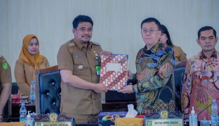 Medan, POL | Pemko Medan bersama dengan DPRD Kota Medan telah menyetujui Rancangan Peraturan Daerah (Ranperda) Kota Medan tentang Pajak dan Retribusi Daerah dalam Rapat Paripurna di Gedung DPRD Kota Medan, Senin (4/12/2023). Persetujuan bersama ini ditandai dengan penandatanganan yang dilakukan langsung Wali Kota Medan Bobby Nasution dan Ketua DPRD Kota Medan Hasyim SE.