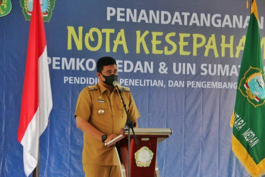 Medan, POL | Pemko Medan dan Universitas Islam Negeri Sumatera Utara Medan (UINSU) menjalin kerjasama Memorandum of Understanding (MOU) dalam bidang pengembangan pendidikan, penelitian, pengabdian masyarakat dan pelatihan dewan pengawas koperasi syariah Masjid. Kerjasama ini ditandai dengan penandatanganan bersama antara Wali Kota Medan, Bobby Nasution dengan Rektor UIN Sumatera Utara, Syahrin Harahap di Kampus UINSU, Senin (8/11/2021).