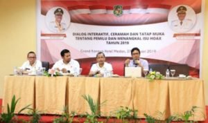Medan | POL Wali Kota Medan Drs H T Dzulmi Eldin S MSi MH diwakili Sekretaris Dinas Kominfo Kota Medan Mansyur Syah membuka Dialog Interaktif, Ceramah dan Tatap Muka Tentang Pemilu 2019 dan Penangkalan Isu Hoax Kepada Masyarakat di Hotel Grand Kanaya Jalan Darussalam Medan, Rabu (27/2).