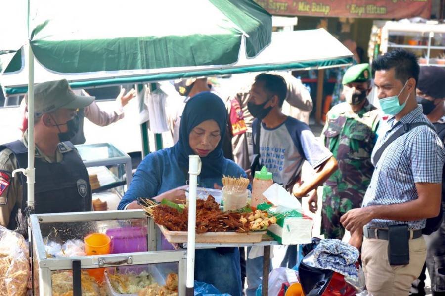 Tim gabungan juga memasuki warung nasi. Kepada pemilik warung, tim gabungan meminta pemilik warung agar menyediakan fasilitas cuci tangan dan mengingatkan pengunjung untuk jaga jarak. (POL/COS)