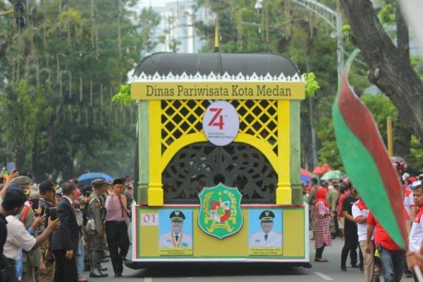 Medan , POL |Pemko Medan ikut pawai pembangunan yang diselenggarakan Pemerintah Provinsi Sumatera Utara guna memeriahkan peringatan HUT ke-74 Kemerdekaan Republik Indonesia tahun 2019. Selain pawai pembangunan dengan menurunkan belasan mobil hias, Pemko Medan juga menampilkan Tarian Ahoii Nusantara yang kini menjadi tarian ikon Kota Medan.