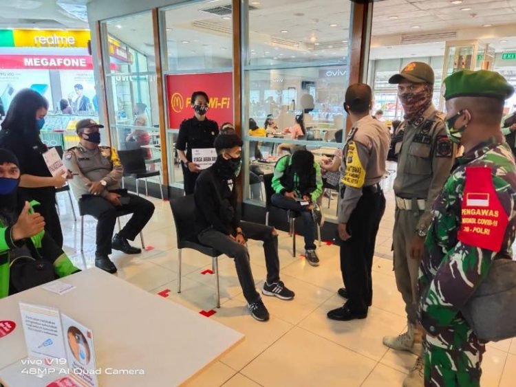 Medan, POL | Tim gabungan Pemko Medan melalui Satpol PP Kota Medan bersama unsur Forkopimda Kota Medan yang terdiri dari Polri dan TNI melakukan Pendisiplinan Protokol Kesehatan di tempat-tempat umum salah satunya di mall yang ada di Kota Medan, Kamis (23/7/2020). Kegiatan ini dilakukan selain untuk menegakkan Peraturan Wali Kota (Perwal) Nomor 27 tahun 2020 tentang Pedoman Adaptasi Kebiasaan Baru di masa Pandemi Covid-19, juga untuk melihat langsung mall yang sedang beroperasi dan melihat protokol kesehatan yang diterapkan ditempat tersebut.