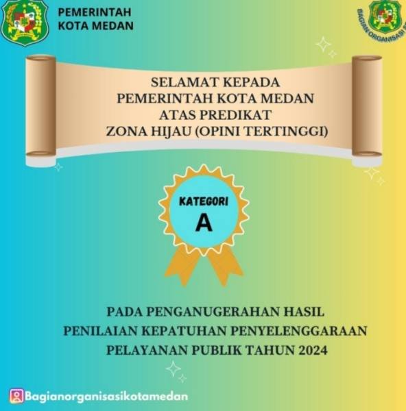 Medan, POL | Pemko Medan berhasil meraih Predikat Zona Hijau (opini tertinggi) Penilaian Kepatuhan Penyelenggaraan Pelayanan Publik dari Ombudsman RI dengan nilai 91.28 (Kategori A).