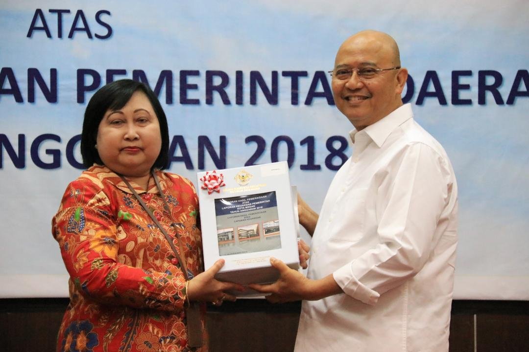 Medan, POL | Wali Kota Medan Drs H T Dzulmi Eldin S MSi MH menerima Laporan Hasil Pemeriksaan (LHP) atas  Laporan Keuangan Pemerintah Daerah Tahun Anggaran 2018 di Kantor Badan Pemeriksa Keuangan (BPK) RI Perwakilan Sumut, Jalan Imam Bonjol Medan, Rabu (22/5). Laporan tersebut diserahkan langsung Kepala BPK RI Perwakilan Sumut Dra Ambar Wahyuni MM.