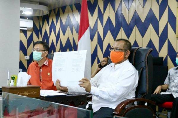 Medan, POL | Pelaksana tugas (Plt) Wali Kota Medan Ir H Akhyar Nasution MSi menerima Laporan Hasil Pemeriksaan (LHP) atas Laporan Keuangan Pemerintah Daerah (LKPD) Tahun Anggaran 2019, Jumat (24/4). Prosesi penyerahan LHP dilakukan melalui sambungan Video Conference (Vidcon) di Command Center Balai Kota Medan.
