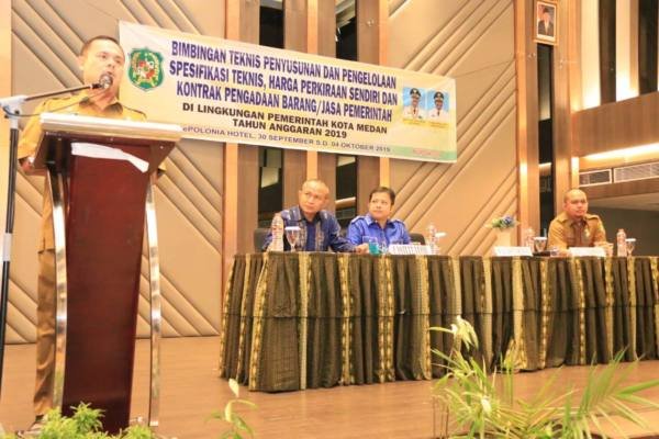 Medan, POL | Pemko Medan melalui Badan Kepegawaian Daerah dan Pengembangan Sumber Daya Manusia (BKD & PSDM) Kota Medan menggelar Bimtek Penyusunan dan Pengelolaan Spesifikasi Teknis, Harga Perkiraan Sendiri dan Kontrak Pengadaan Barang/Jasa Pemerintah di Lingkungan Pemko Medan Tahun Anggaran 2019 di Le Polonia Hotel Medan, Senin (30/9/2019).