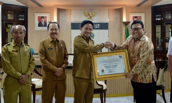 Medan, POL | Pemerintah Provinsi (Pemprov) Sumatera Utara (Sumut) kembali meraih predikat Zona Hijau kualitas tinggi untuk penilaian kepatuhan penyelenggaraan pelayanan publik tahun 2023. Piagam penghargaan tersebut diserahkan langsung Anggota Ombudsman Republik Indonesia (RI) Dadan Suparjo Suharmawijaya kepada Penjabat (Pj) Gubernur Sumut Hassanudin, di Kantor Gubernur, Jalan Diponegoro 30, Medan.