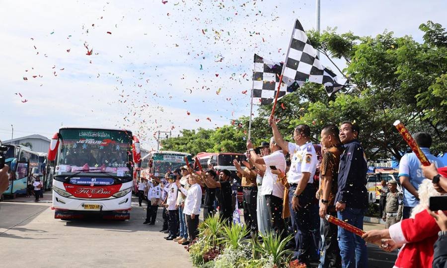 Medan, POL | Pemerintah Provinsi (Pemrpvo) Sumatera Utara (Sumut) melepas keberangkatan 1.200 peserta Mudik Gratis Natal dan Tahun Baru (Nataru) 2024/2025. Acara berlangsung di Terminal Amplas, Jalan Panglima Denai, Medan, Sabtu (21/12/2024).
