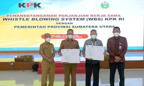 Medan, POL | Pemerintah Provinsi (Pemprov) Sumatera Utara (Sumut) melakukan Penandatanganan Perjanjian Kerja Sama Whistle Blowing System (WBS) dengan Komisi Pemberantasan Korupsi (KPK) RI terkait Penanganan Pengaduan Pemberantasan Tindak Pidana Korupsi. Hal tersebut merupakan wujud komitmen Pemprov Sumut terhadap upaya pencegahan dan pemberantasan korupsi.